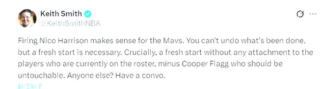 但平心而論,哈里森真的該獨自背下所有黑鍋嗎?NBA名記Brett Siegel一語道破真相:“如今解雇哈里森的人(杜蒙特),正是當初批準交易東契奇的人!”當初為了省錢,老板杜蒙特親自點頭送走球隊核心,如今戰(zhàn)績糟糕,為了安撫球迷,只能讓總經(jīng)理當“替罪羊”——總不能讓老板炒掉自己吧?更有意思的是,杜蒙特昨天和球迷互動時,已經(jīng)親口承認交易東契奇是個錯誤。要知道,今年2月交易完成后,他還公開批評東契奇“不夠努力,想度假就去別的地方”,如今翻臉比翻書還快,著實讓人唏噓。